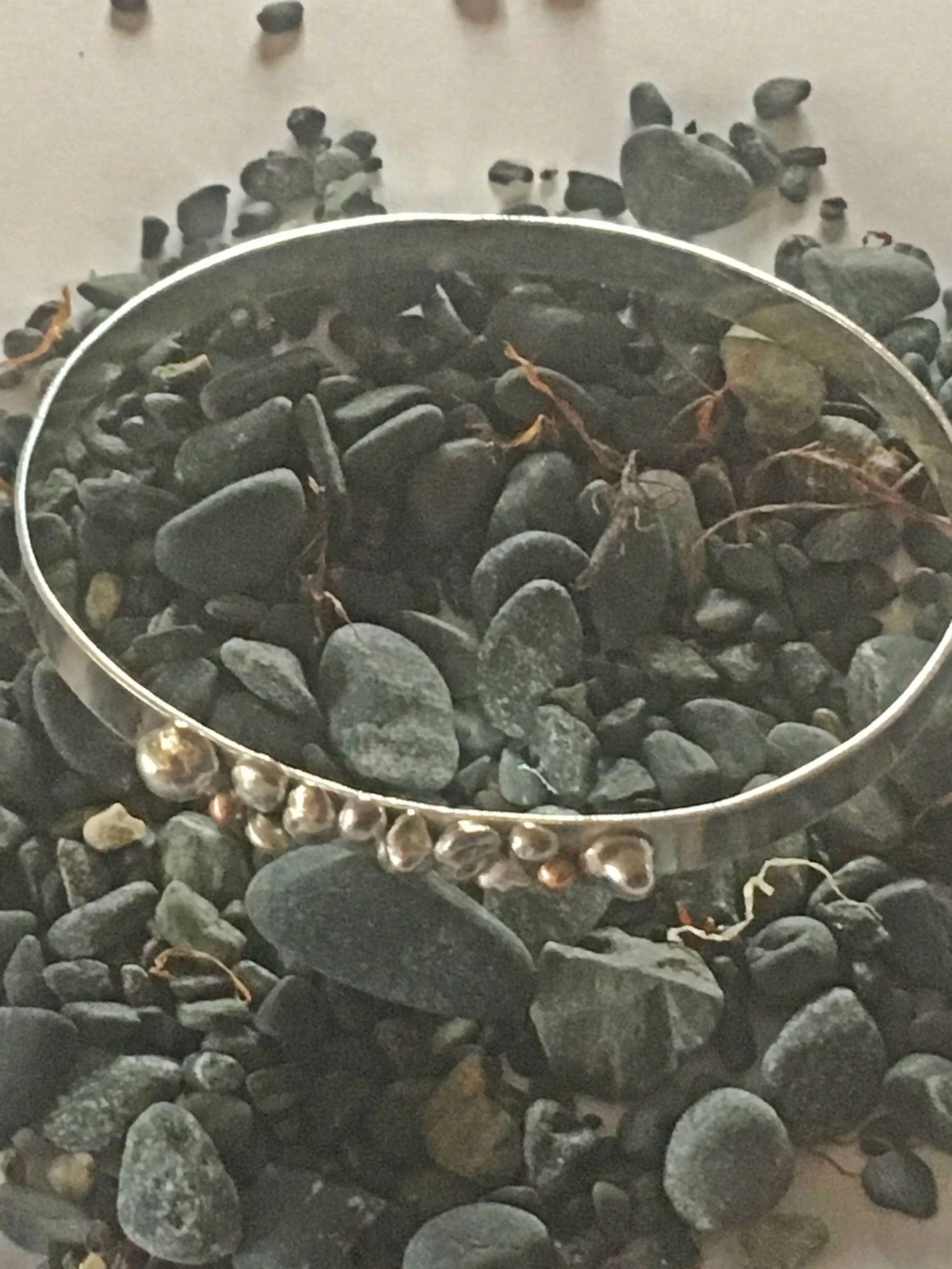 The roar of the splash as pebbles tumble through a majestic wave are caught in this collection of granulated pieces of silver and copper. Coves around our coast are hidden gems, hiding caves and rock formations. Coves here, are reflected in the copper which surround lightly textured silver.